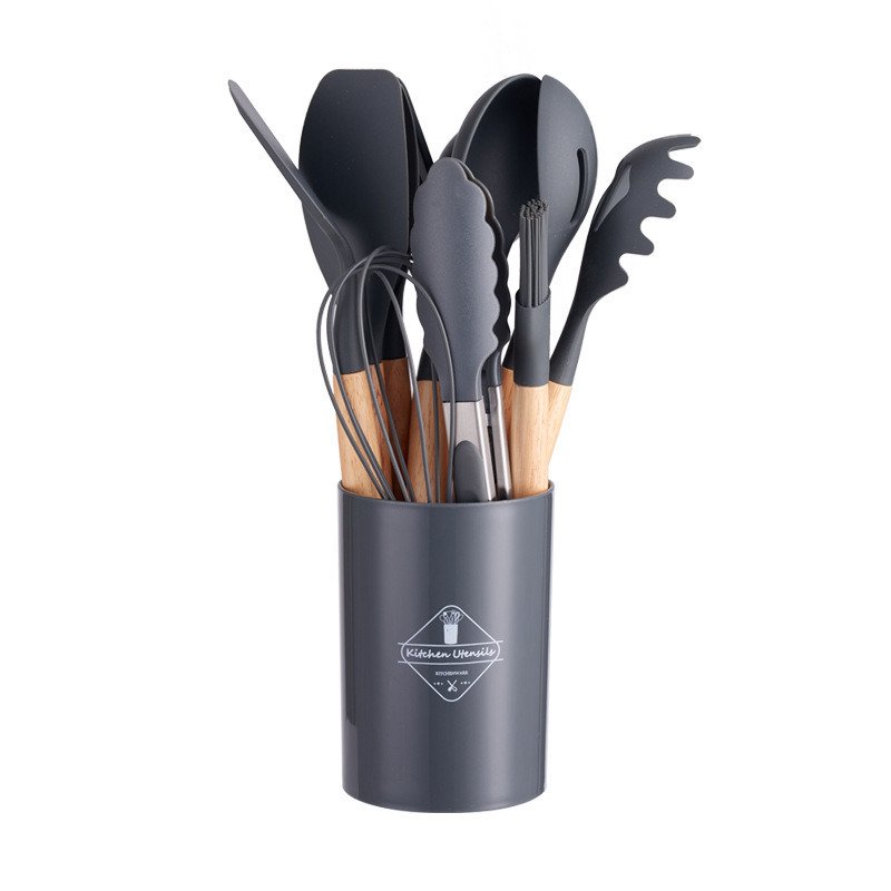 11pcs Wooden Handle Silicone Kitchen Utensils Set Storage Bucket Non-stick Shovel Spoon Cooking Kitchen Utensils 11 Pieces Set Silicone Shovel Spoon