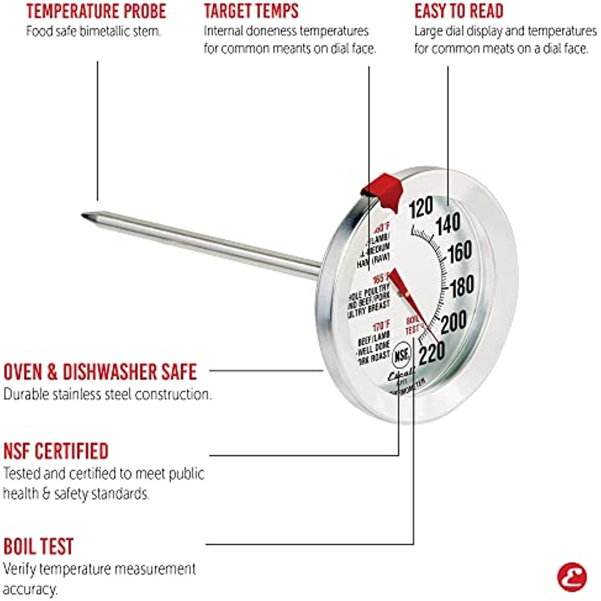 Made to Melt in your Mouth: The Escali Oven Safe Meat Thermometer features target cooking temperatures printed on an easy to read dial display for quick reference. It has a durable stainless steel design which is NSF certified; oven safe and dishwasher safe. Oven Safe: The durable stainless steel construction allows the thermometer to be left in meat as it is cooking in an oven or grill. Target Cooking Temperatures: Internal cooking temperatures are labeled on the large dial display for easy reference when preparing beef; poultry; pork; veal & lamb. NSF Certified: The manufacturing process of this product is regularly checked and certified by the National Sanitation Foundation and meets the highest standards for public health protection. Large Easy to Read Dial: The large dial display is easy to read and features both fahrenheit and celsius measurements. Dishwasher Safe: The premium stainless steel construction is durable and dishwasher safe.